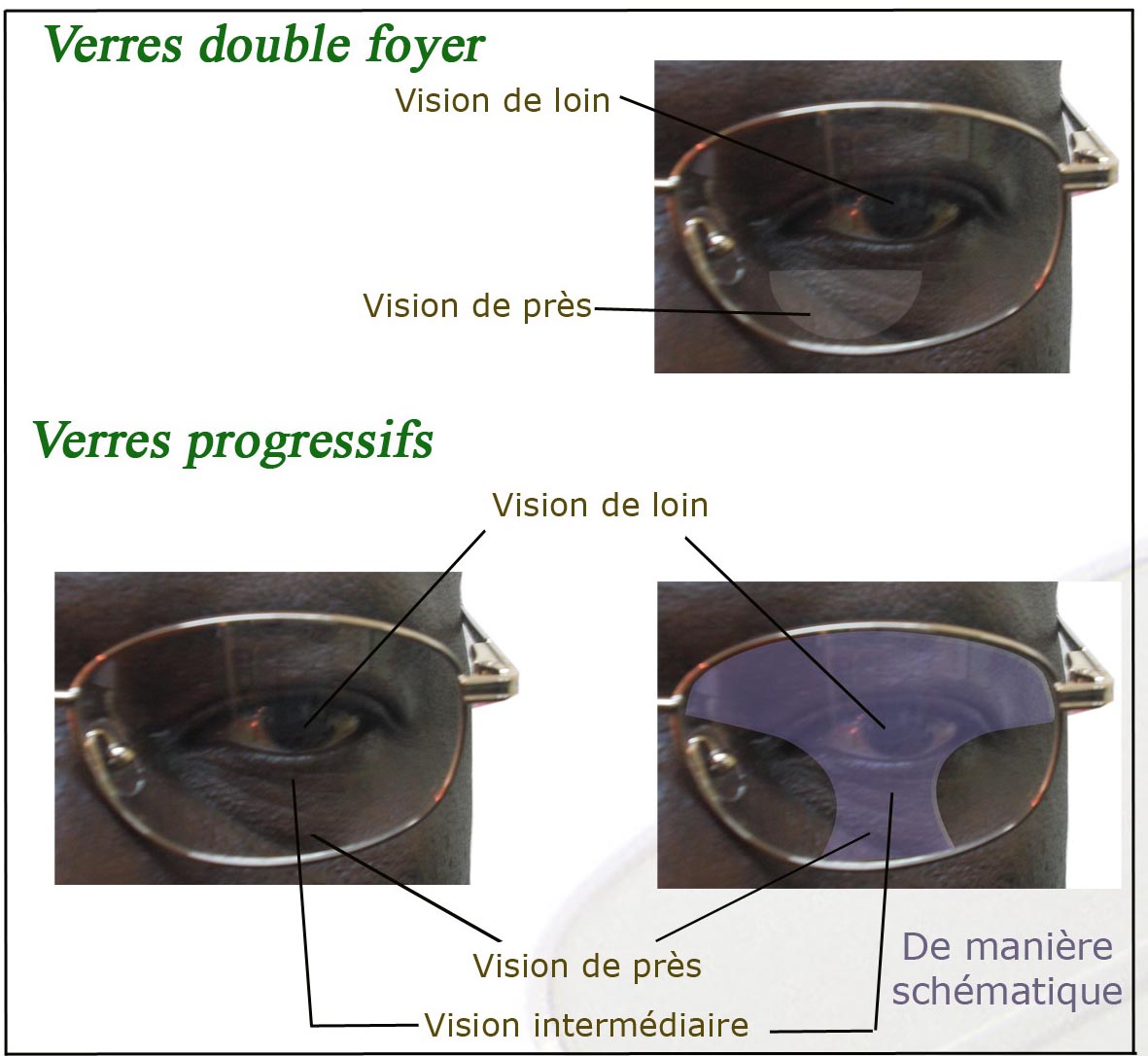 Ce sont de prêt à porter alors que vos yeux ont besoin d’une prescription sur mésure. Ces lunettes risquent d’être source de fatigue visuelle. Il existe des verres minéraux (« en verre ») et des verres organiques (en plastique).