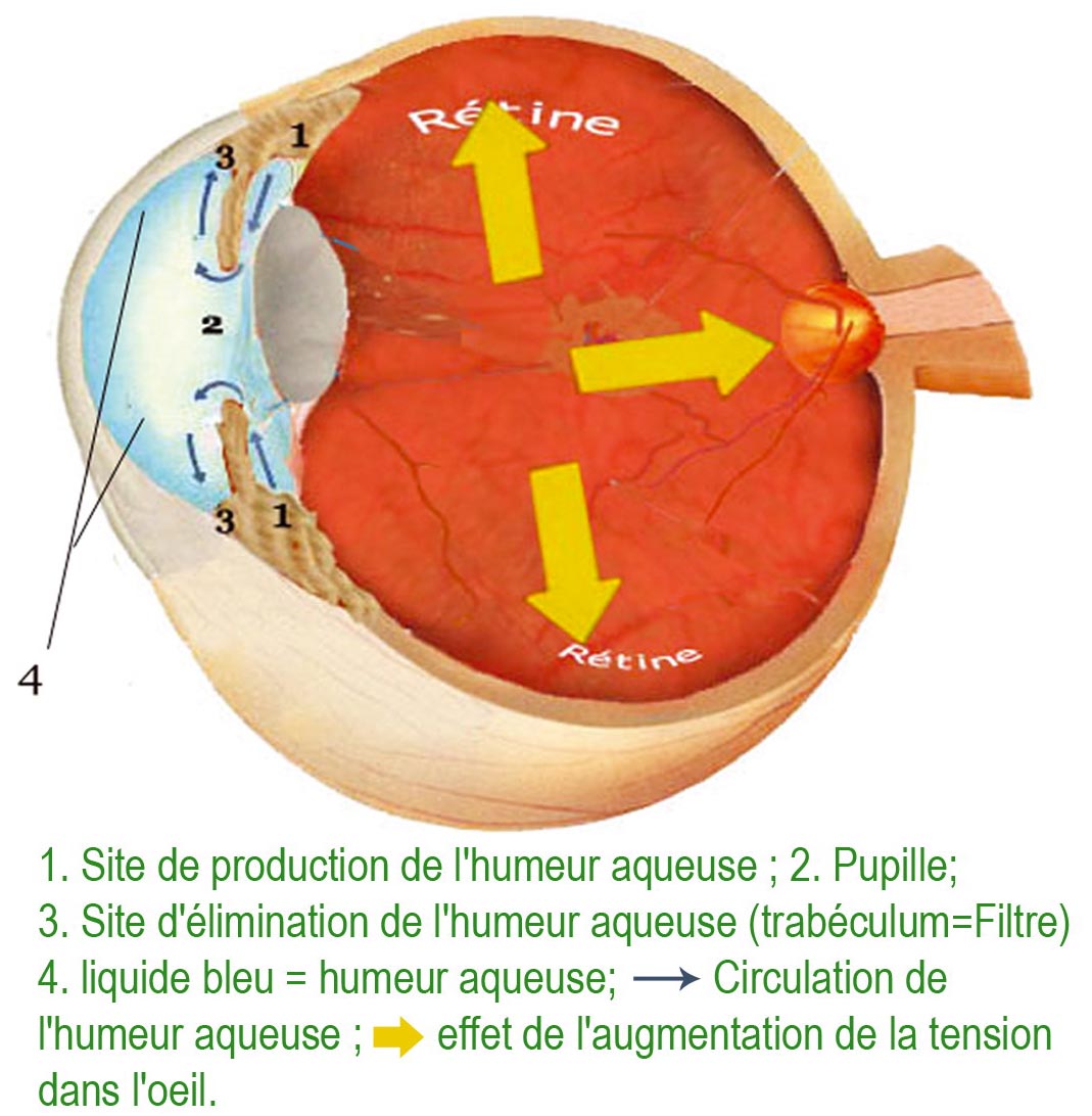 Tout comme le corps humain, l’œil possède également sa propre tension, qui est régulée par la production et l’élimination d’un liquide dans l’œil appelé « humeur aqueuse » (sans rapport avec les larmes).